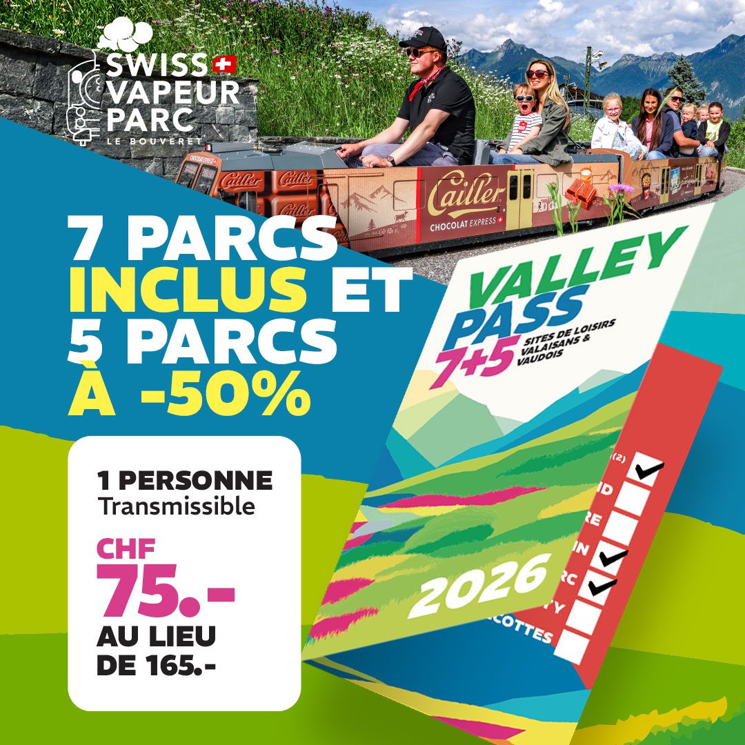 Parc ouvert tous les jours de 10h à 18h. BILLET DÉGRIFFÉ DATÉEnfant / Adulte BILLET NON DATÉEnfant / Adulte SOUPER CHASSE DU 18.10 Entrée incluse VALLEYPASS 7+5 7 parcs inclus (dont le Swiss Vapeur Parc) + 5 parcs à -50% En savoir plus Abonnement VIP 4.6/5 sur plus de 5025 avis ! C'est génial, très belle découverte pour petits et grands... Des casiers pas loin des WC. Table de pic nic ,balade avec le chien . DElphine TBL11 août 2025 Endroit magiques pour toutes personnes et générations 👍😁 Anne Bonzon11 août 2025 Accueil très sympathique, personnel serviable et à l'écoute. Excellente journée en famille. Rolland Franck11 août 2025